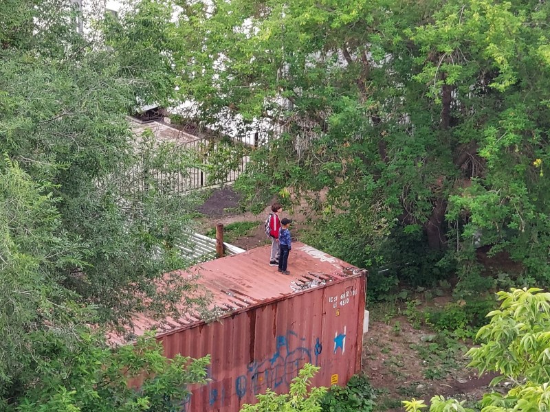 Более того, ребята не просто взбирались на крышу строительного вагончика, они пробирались на эту стройку и устраивали там игры. О надежности конструкций говорить не приходится. Они были возведены давно и за все время явно успели прийти в негодность. Сама территория неухоженная, вокруг куча дикой травы и кустарника. Помимо того, что сюда в поисках приключений прибегала местная ребятня, четвероногие также нашли здесь для себя приют.