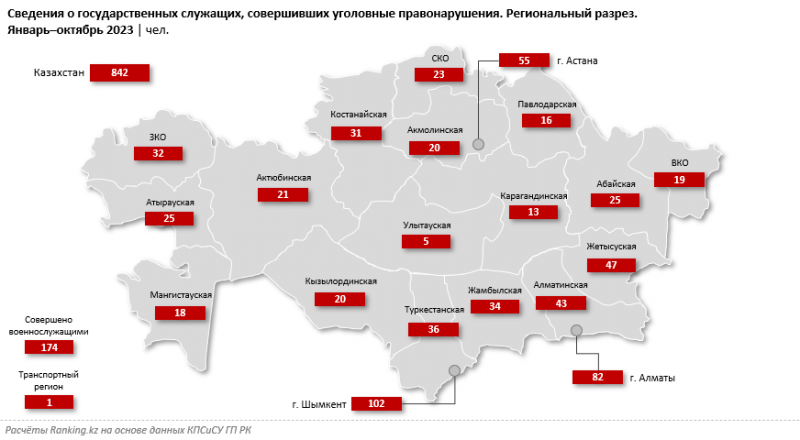 За январь–октябрь 2023 года в Казахстане уголовные правонарушения совершили 842 государственных служащих — на 5% меньше, чем годом ранее.