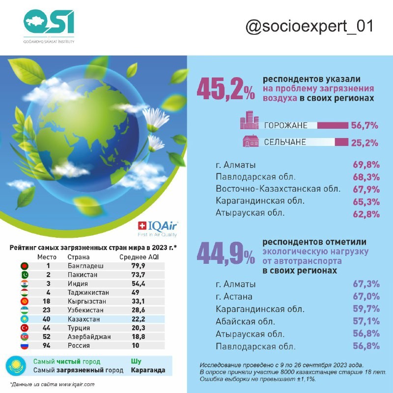 Согласно результатам социологического исследования Қоғамдық саясат институты (QSI), 45,2% респондентов указали на загрязнение воздуха как на проблему в своих регионах. Особенно остро эту проблему ощущают горожане (56,7%), в отличие от сельских жителей (25,2%). В антирейтинге лидируют крупные города и промышленные регионы – г. Алматы (69,8%), Павлодарская (68,3%), Восточно-Казахстанская (67,9%), Карагандинская (65,3%) и Атырауская (62,8%) области.