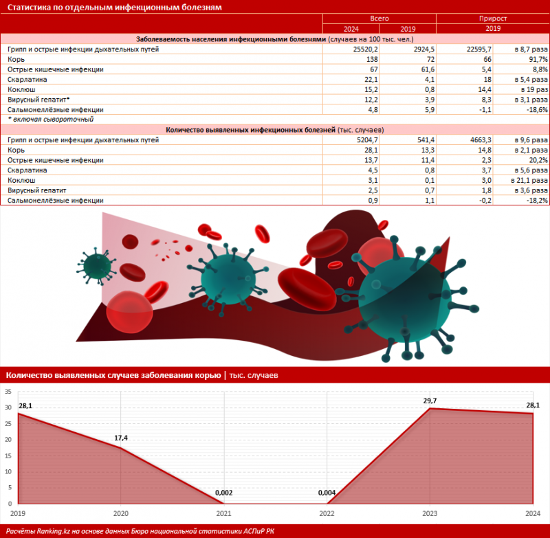 За последние несколько лет в Казахстане значительно выросла заболеваемость населения отдельными инфекционными болезнями. Большинство из них — вакциноуправляемые, и многие случаи заболевания можно было бы предотвратить. Сравним данные, публикуемые Бюро национальной статистики АСПиР РК, по заболеваемости на 100 тыс. населения за 2024 и 2019 годы. Так, в прошлом году заболеваемость коклюшем выросла по сравнению с 2019-м в 19 раз, скарлатиной — в 5,4 раза, вирусным гепатитом — в 3,1 раза, корью — почти в 2 раза. В абсолютных значениях количество случаев заболевания этими инфекциями также значительно увеличилось.