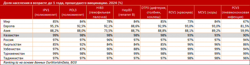 Международные данные позволяют сравнить показатели охвата иммунизацией по странам только для категории детей младше одного года. Именно в этом возрасте чаще всего дети получают первые дозы вакцин (если те относятся к инактивированным). Согласно информации портала международной базы данных OurWorldinData, Казахстан можно отнести к странам, в которых наблюдается высокий уровень охвата вакцинацией малышей до одного года. Например, по итогам 2024-го доля детей этого возраста, привитых от полиомиелита, гепатита В, коклюша, столбняка и дифтерии превышала 98%. Против кори были привиты всего 93% казахстанцев в возрасте до года, против краснухи — 93%, против пневмококковой инфекции — 90%. Абсолютно по всем видам вакцин уровень охвата в Казахстане оказался выше, чем в Европе, Азии и в целом в мире.