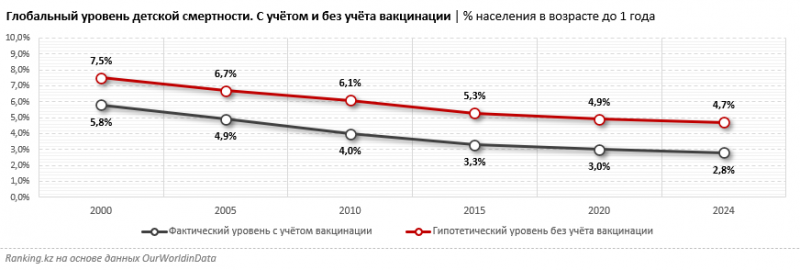 В инфографике мы показали, насколько велика разница между фактической детской смертностью с учётом вакцин (от всех видов причин) и смертностью без прививок: 2,8% против 4,7%. Если антипрививочные настроения победят коллективный иммунитет, этот прогресс очень быстро нивелируется. В настоящее время Казахстан демонстрирует нулевую заболеваемость по многим инфекциям — брюшному тифу, дифтерии, холере, чуме и т. д. Этого «невидимого» эффекта удалось добиться только благодаря вакцинам.
