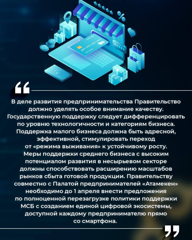 По словам Ерканата Мусылманбека, переход к цифровой модели регулирования с использованием ИИ и блокчейна — это не вопрос будущего, а насущная необходимость для устойчивого развития несырьевого сектора и малого и среднего бизнеса в регионах.